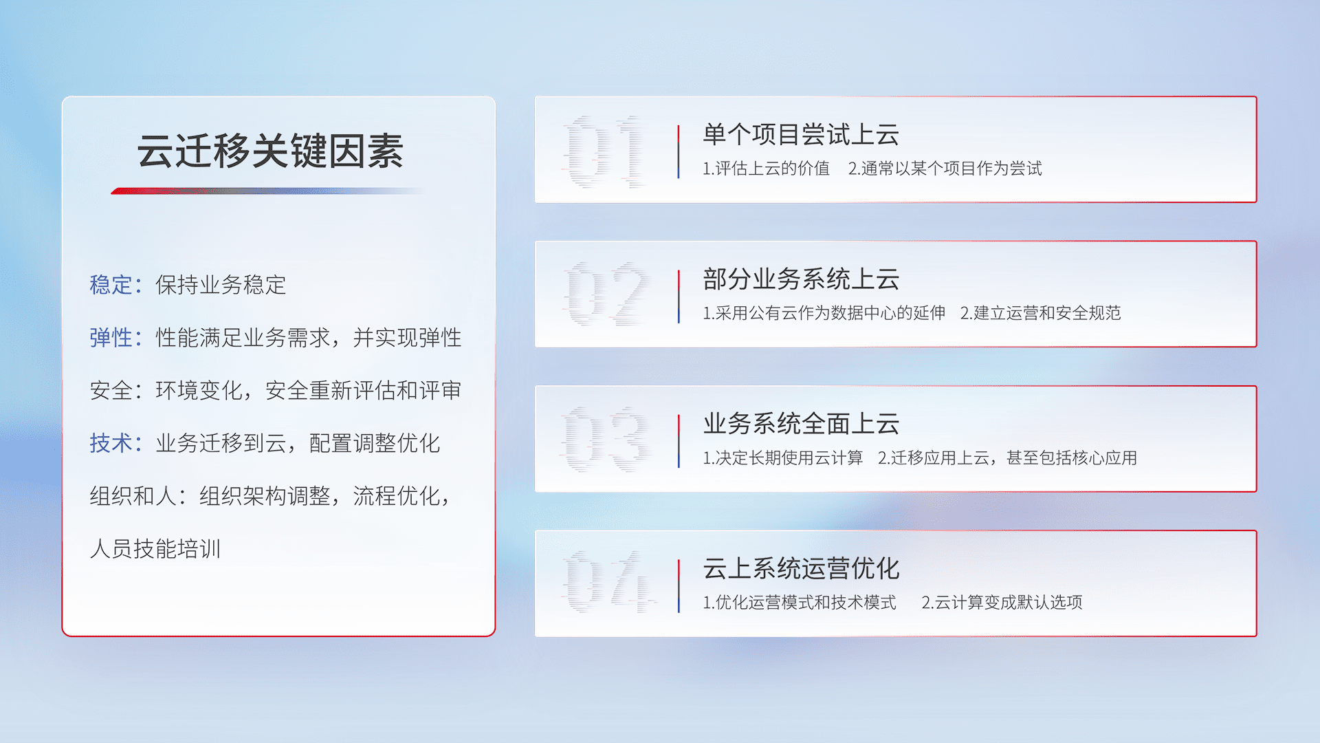 结合实际业务,,,,从规划设计、、、云平台选型、、、、云原生改造、、、、数据迁移、、、集成交付,,,,迁移全过程为客户识别最佳上云路径,,做好风险识别管理,,,,设计网络架构、、身份权限、、、安全审计合规、、、、操作审计、、日志审计、、监控告警策略、、、多站点容灾设计等,,对云上基础设施进行整体规划,,提升IT治理水平,,,,以满足弹性、、、、高可用、、、高性能的需求。。。。